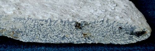 Radially oriented cross section through a fragment, showing skeletal structure and internal canalization. Gastral side on top. The spiculation consists of rather large and sculptured rhizoclones. Reports about the lack of a cortex on Amphithelion macrommata were rightfully questioned by Reid (2004). The above specimen shows a weakly developed cortex in the central parts of the gastral depression (slightly darker colour). The cortex differs however from the smooth and glossy cortex known from similar sponges. Instead, it is made up of densely packed and apparently enlarged rhizoclones.