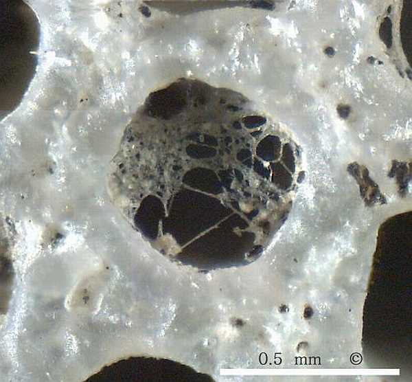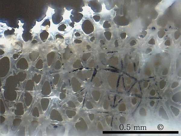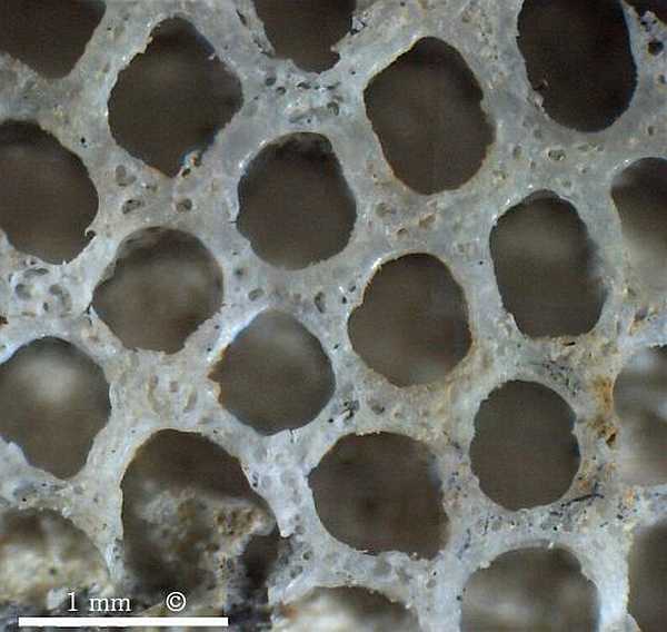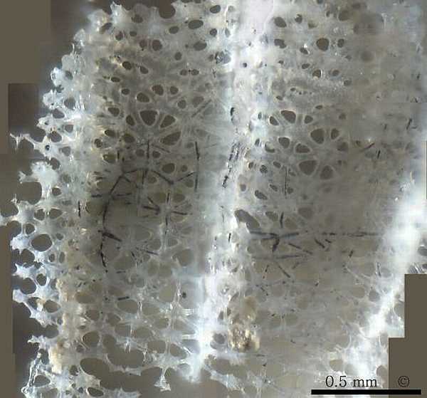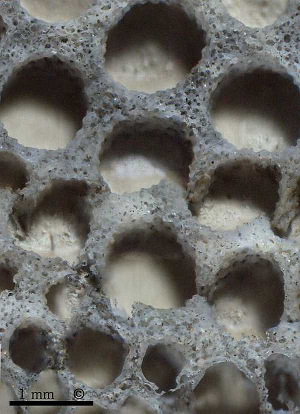 The external wall of Aphrocallistes cylindrodactylus is approximately 1 mm thick and is perforated by radial channels (diarhyses), very similar to Aphrocallistes alveolites.