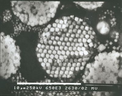 ![]() Framboidal pyrite as part of a pyritized sponge. Höver. Reflected light photomicrograph; oil immersion. ![]() Pyrite framboid (ordered type). Höver. SEM-photomicrograph. ![]() Example of an eroded sponge. |