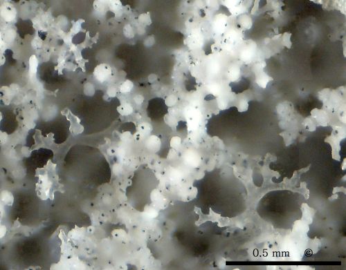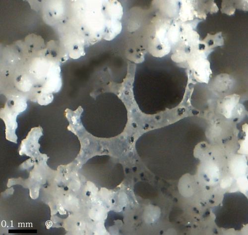 Spiculation of cf. Phrissospongia glandiformis from Höver. - Photomicrographs of an etched fragment of the above shown specimen The first photomicrograph shows two megarhizoclonids in cavities of the dicranoclone skeleton. A dermal dichotriaene is visible in the top left corner. The second picture shows the normal dicranoclone skeleton and the transition to the dermal layer (bottom of image) composed of sculptured dichotriaenes. The third picture is a closer view of the dermal layer, composed of tiny, sculptured dichotriaenes. The fourth picture is a close-up view of a megarhizolone surrounded by dicranoclones. The fifth image shows a dermal dichotriaene in situ. Isolation of individual scleres proved very difficult, due to the densely intergrown and stable nature of the skeleton. Even completely acid-leached samples do not disintegrate. The photographic equipment had to be pushed to its limits since the scleres of cf. Phrissospongia glandiformis are extremely small by comparison to almost all other sponges. |