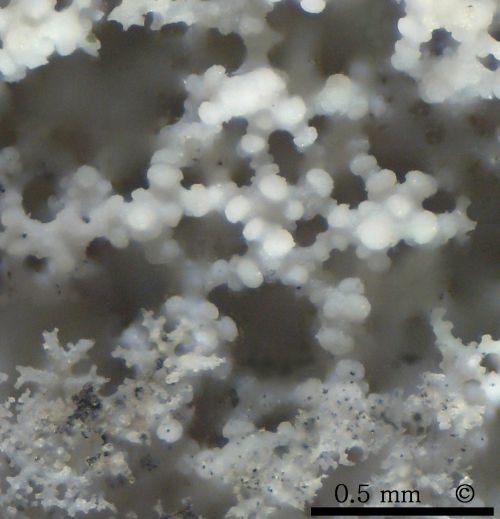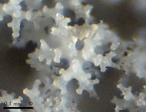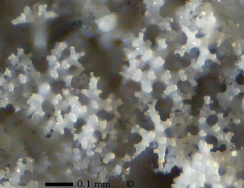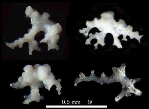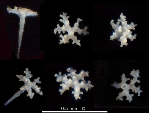 Isolated dermal dichotriaenes of cf. Phrissospongia glandiformis from Höver. Typically, the forked clads of the triaenes show short side branches near their tips and within the fork plane, making them look like snow crystals. Additionally, there are wart-like knobs on the outward facing sides of the clads. The bottom right dichotriaene is shown from its underside, shaft (rhabdome) broken off. Notice black lines in rhabdome and clads which correspond to former axial filaments. |