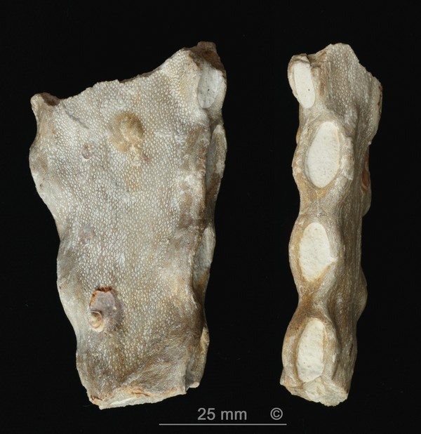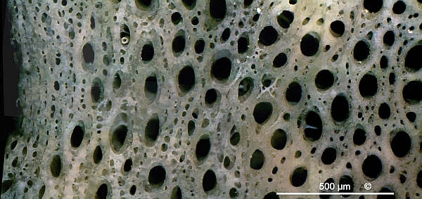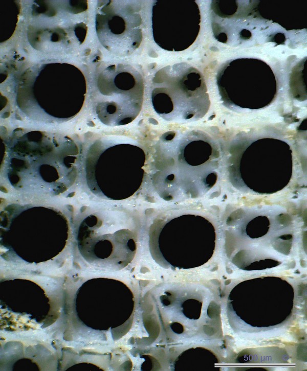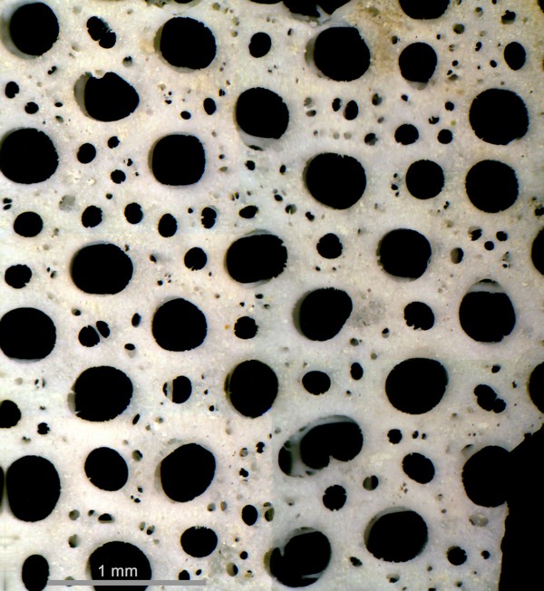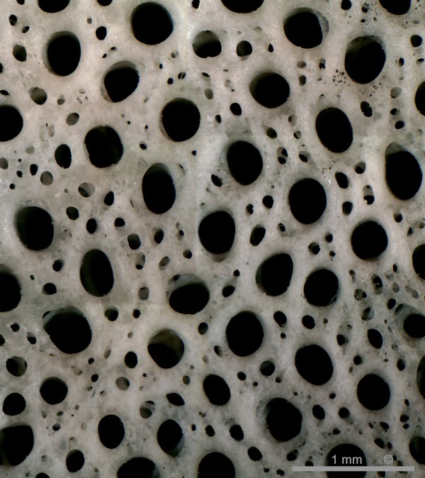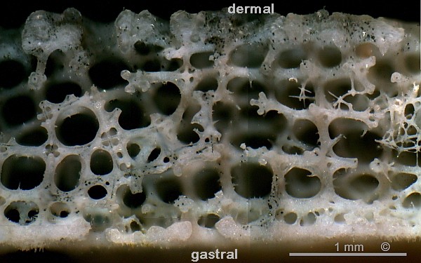The dermal surface is covered by a rather massive cortex (Figure 7), which leaves round pores (ostia) on every other mesh of the dictynal skeleton (chess board pattern), while the other half of the dictynal meshes are shut by a porous netting (Figure 8). The surface of the dermal cortex is smooth. The gastral surface is covered by a less massive cortex (Figure 9). However, the general structure is similar to that of the dermal surface, leaving round pores (postica) on every other mesh of the dictyonal skeleton (chess board pattern). The gastral cortex has a velvet-like surface (Figure 5 may give a vague idea). |
