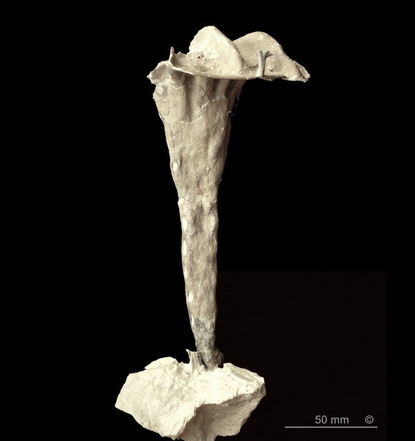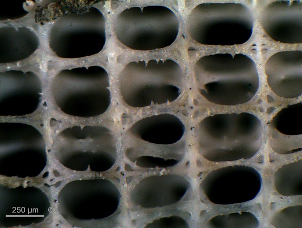 The skeleton of Pleurope lacunosa is composed of several layers of dictyonal lychnisks with pronounced cortex formations on the gastral and dermal surfaces (Figure 5). Notice smaller hexactines attached to the lychnisk skeleton. Such hexactines are abundant near the narrow edges of the stem, i.e.around the parietal oscula, but absent otherwise. The dictyonal skeleton looks very regular in side view (Figure 6). However, as seen in Figure 5 (cross section), the lychnisk layers form an acute angle with the dermal and gastral surface, introducing some mismatch between subsequent layers. This feature is probably restricted to the stem section. No particular epirhyses or aporhyses are developed. Instead, water circulation passes through the meshes of the skeleton. |