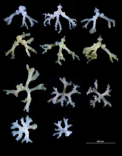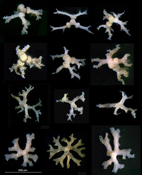 Two etched samples of Prokaliapsis clavata, revealing the very dense skeleton.