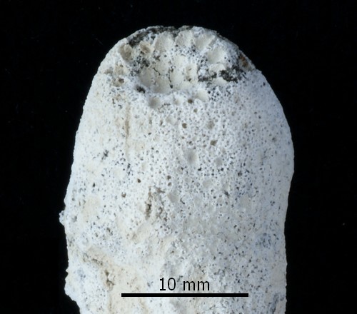 The largest known individuals are close to 100 mm tall and 40 mm wide at their apices. The apex is flat and shows many postica (1.5 mm wide) of tubular aporhysal canals which transverse the sponge longitudinally. Anastomosing aporhysal furrows are prominent in the upper and lower sections of typical individuals, while in the mid-section, there are characteristic macro-pores with "bird-foot",inverted v- or y-shaped apertures instead.