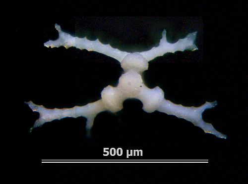 The image shows a typical trider of Prokaliapsis clavata. The triders show ring-like swellings near the base of the arms (clads), and one arm is reduced to a knob-like brachyome. (These features place Prokaliapsis clavata into the family Phymaraphiniidae.)