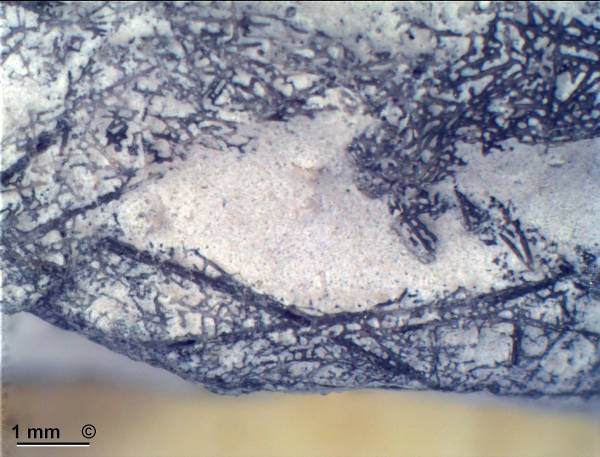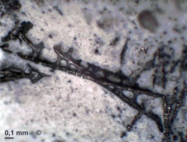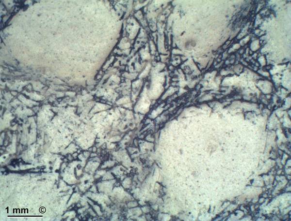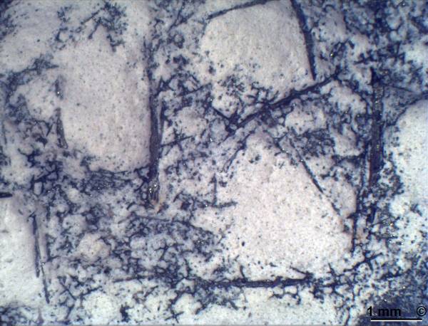 The skeleton of Regadrella petrijacobi is constructed from longitudinal to diagonal principalia, mainly diactines, which are probably up to 20 mm long, or even longer. Indications of axial canals (hollow or pyritized). Neighboring principalia are connected by synapticulate bridges, which often form ladder like structures. Recognizable comitalia consist of diactines and hexactines, coated and fused together by silica cement. Gastralia are hexactines (perhaps pentactines and stauractines). |