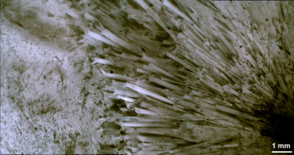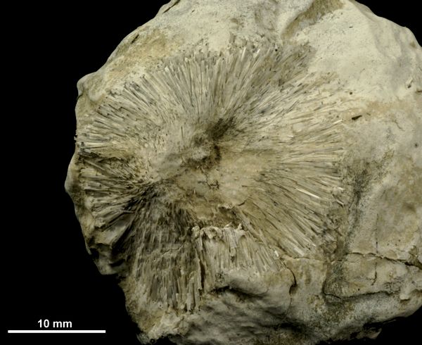 hemisperical fragment with radiating needles, etched. Teutonia North, Misburg vulgaris Zone