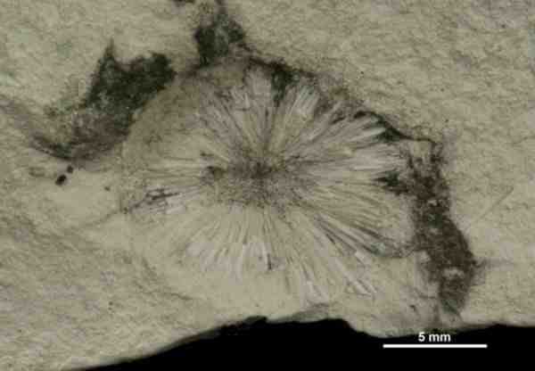 In the quarry, specimens are inconspicuos and are only discovered when broken, revealing their plumose skeleton structure.